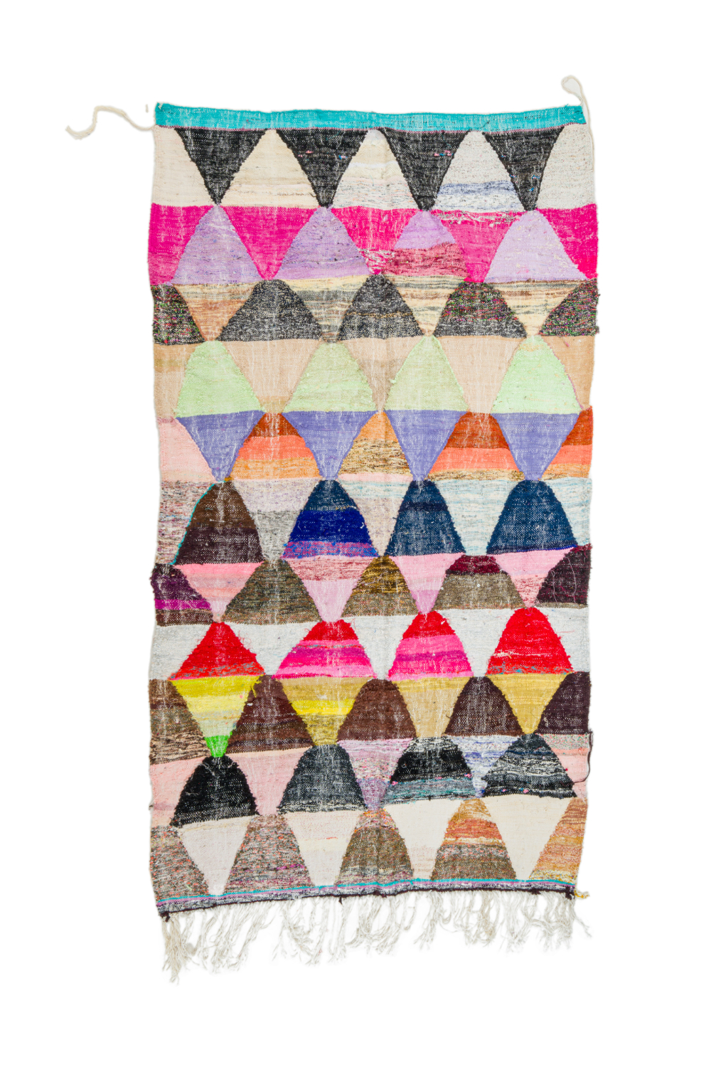 Der Boucherouite-Teppich reiht sich in die fantastischen Teppichkreationen ein, die aus Marokko kommen. Als Flickenteppich wird er aus gebrauchten Textilien wie Wolle, Garn, Kunstfasern und anderen Textilmaterialien hergestellt, die wiederverwertet werden können. Dieser wunderschöne marokkanische Flickenteppich ist das Ergebnis der Veränderungen, die in den letzten Jahren in Marokko auf dem Land stattgefunden haben, wo die herkömmlich nomadische Kultur fester Landwirtschaft und anderen Formen des Broterwerbs gewichen ist. Hierdurch ist die kostbare Schurwolle, das Material der Beni-Ourain- und Azilal-Teppiche, noch seltener geworden. Deswegen ist es umso wichtiger, gebrauchte Textilien wiederzuverwerten. Die marokkanischen Frauen auf dem Land haben hierin unvergleichliche Fähigkeiten entwickelt. Die Farben und das Muster des Boucherouite-Teppichs kennen wir bereits vom Azilal-Teppich. Beide Teppiche sind auf Kunstausstellungen weltweit zu sehen.
