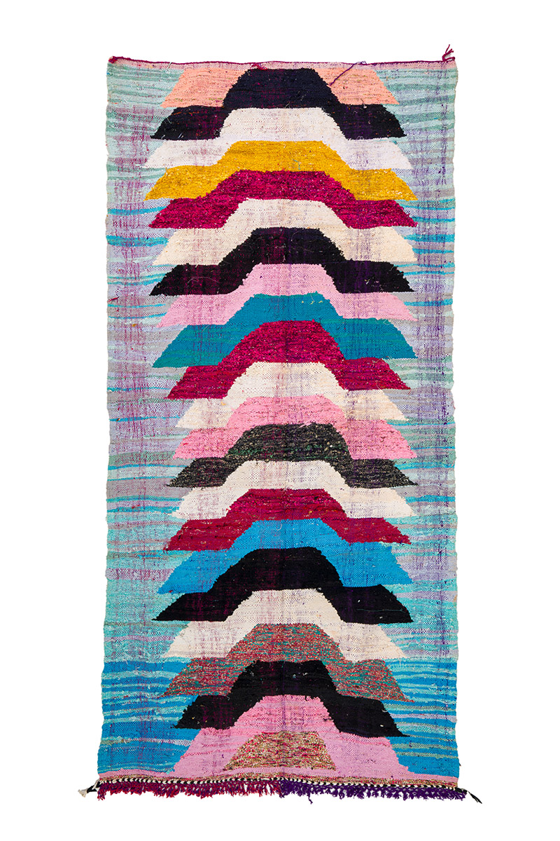 Der Boucherouite-Teppich reiht sich in die fantastischen Teppichkreationen ein, die aus Marokko kommen. Als Flickenteppich wird er aus gebrauchten Textilien wie Wolle, Garn, Kunstfasern und anderen Textilmaterialien hergestellt, die wiederverwertet werden können. Dieser wunderschöne marokkanische Flickenteppich ist das Ergebnis der Veränderungen, die in den letzten Jahren in Marokko auf dem Land stattgefunden haben, wo die herkömmlich nomadische Kultur fester Landwirtschaft und anderen Formen des Broterwerbs gewichen ist. Hierdurch ist die kostbare Schurwolle, das Material der Beni-Ourain- und Azilal-Teppiche, noch seltener geworden. Deswegen ist es umso wichtiger, gebrauchte Textilien wiederzuverwerten. Die marokkanischen Frauen auf dem Land haben hierin unvergleichliche Fähigkeiten entwickelt. Die Farben und das Muster des Boucherouite-Teppichs kennen wir bereits vom Azilal-Teppich. Beide Teppiche sind auf Kunstausstellungen weltweit zu sehen.