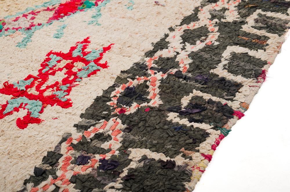 Der Boucherouite-Teppich reiht sich in die fantastischen Teppichkreationen ein, die aus Marokko kommen. Als Flickenteppich wird er aus gebrauchten Textilien wie Wolle, Garn, Kunstfasern und anderen Textilmaterialien hergestellt, die wiederverwertet werden können. Dieser wunderschöne marokkanische Flickenteppich ist das Ergebnis der Veränderungen, die in den letzten Jahren in Marokko auf dem Land stattgefunden haben, wo die herkömmlich nomadische Kultur fester Landwirtschaft und anderen Formen des Broterwerbs gewichen ist. Hierdurch ist die kostbare Schurwolle, das Material der Beni-Ourain- und Azilal-Teppiche, noch seltener geworden. Deswegen ist es umso wichtiger, gebrauchte Textilien wiederzuverwerten. Die marokkanischen Frauen auf dem Land haben hierin unvergleichliche Fähigkeiten entwickelt. Die Farben und das Muster des Boucherouite-Teppichs kennen wir bereits vom Azilal-Teppich. Beide Teppiche sind auf Kunstausstellungen weltweit zu sehen.