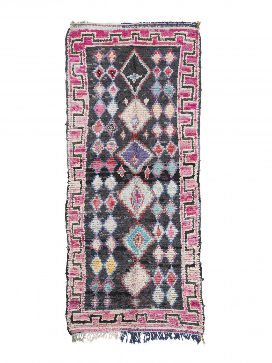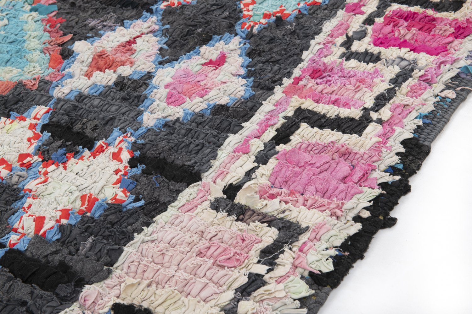 Der Boucherouite-Teppich reiht sich in die fantastischen Teppichkreationen ein, die aus Marokko kommen. Als Flickenteppich wird er aus gebrauchten Textilien wie Wolle, Garn, Kunstfasern und anderen Textilmaterialien hergestellt, die wiederverwertet werden können. Dieser wunderschöne marokkanische Flickenteppich ist das Ergebnis der Veränderungen, die in den letzten Jahren in Marokko auf dem Land stattgefunden haben, wo die herkömmlich nomadische Kultur fester Landwirtschaft und anderen Formen des Broterwerbs gewichen ist. Hierdurch ist die kostbare Schurwolle, das Material der Beni-Ourain- und Azilal-Teppiche, noch seltener geworden. Deswegen ist es umso wichtiger, gebrauchte Textilien wiederzuverwerten. Die marokkanischen Frauen auf dem Land haben hierin unvergleichliche Fähigkeiten entwickelt. Die Farben und das Muster des Boucherouite-Teppichs kennen wir bereits vom Azilal-Teppich. Beide Teppiche sind auf Kunstausstellungen weltweit zu sehen.