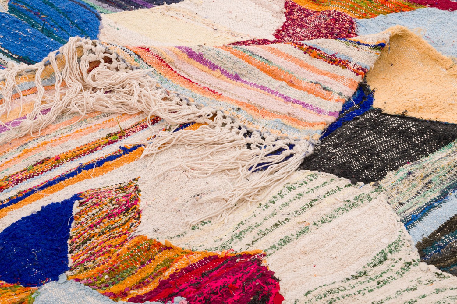 Der Boucherouite-Teppich reiht sich in die fantastischen Teppichkreationen ein, die aus Marokko kommen. Als Flickenteppich wird er aus gebrauchten Textilien wie Wolle, Garn, Kunstfasern und anderen Textilmaterialien hergestellt, die wiederverwertet werden können. Dieser wunderschöne marokkanische Flickenteppich ist das Ergebnis der Veränderungen, die in den letzten Jahren in Marokko auf dem Land stattgefunden haben, wo die herkömmlich nomadische Kultur fester Landwirtschaft und anderen Formen des Broterwerbs gewichen ist. Hierdurch ist die kostbare Schurwolle, das Material der Beni-Ourain- und Azilal-Teppiche, noch seltener geworden. Deswegen ist es umso wichtiger, gebrauchte Textilien wiederzuverwerten. Die marokkanischen Frauen auf dem Land haben hierin unvergleichliche Fähigkeiten entwickelt. Die Farben und das Muster des Boucherouite-Teppichs kennen wir bereits vom Azilal-Teppich. Beide Teppiche sind auf Kunstausstellungen weltweit zu sehen.