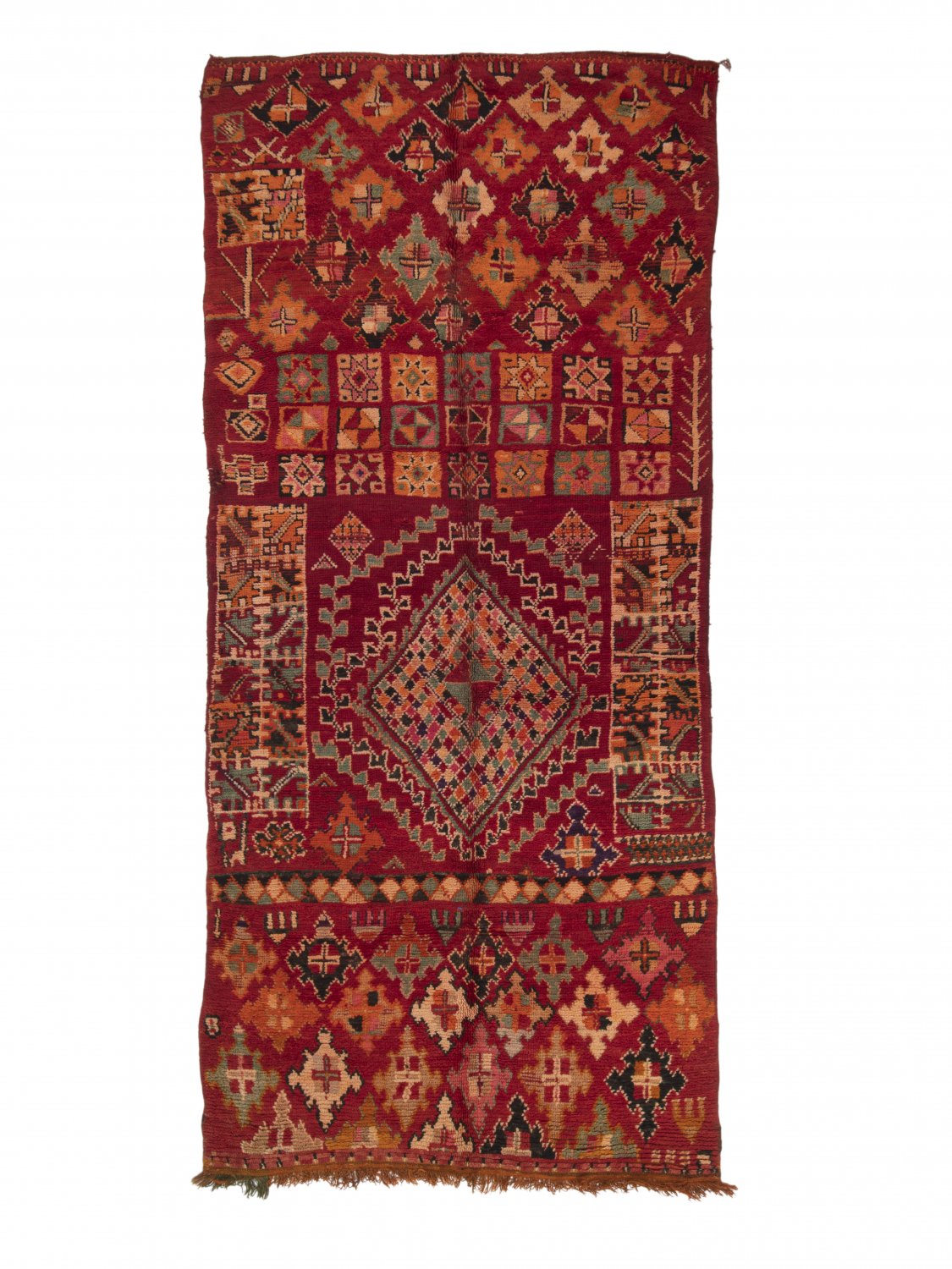 Kreativität und Ausführung, das unregelmäßige Muster und die fantastischen Farbkombinationen – die Geschmäcker sind verschieden. Vermutlich hätte aber kaum jemand etwas dagegen einzuwenden, wenn der Azilal-Teppich zum schönsten Teppich der Welt gekürt würde. Seiner einzigartigen Wirkung kann man sich nur schwer entziehen. Außerdem besteht er zu 100 % aus natürlichen Erzeugnissen. Der weiße/naturfarbene Hintergrund besteht aus der Wolle der Bergschafe und die klaren Farben stammen von wild wachsenden Pflanzen und Beeren der atemberaubenden Bergwelt in der Azilalregion.