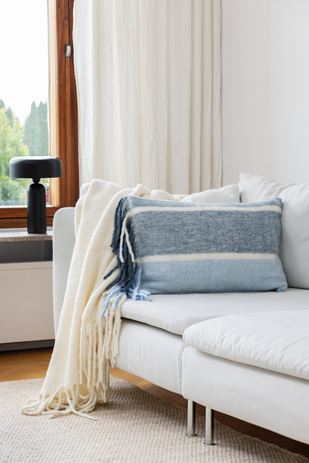 Weicher Kissenbezug aus einem schönen Wollgemisch mit Fransen an der kurzen Seite. Die garngefärbten Kissenbezüge sind in verschiedenen Mustern und Farben erhältlich und können vorteilhaft miteinander kombiniert werden.