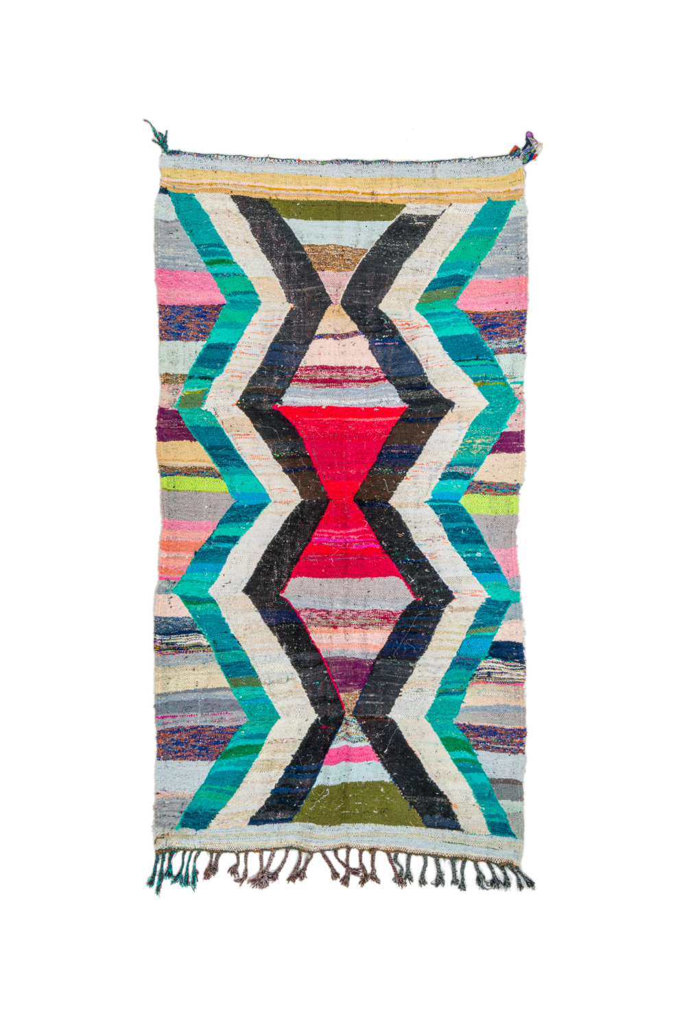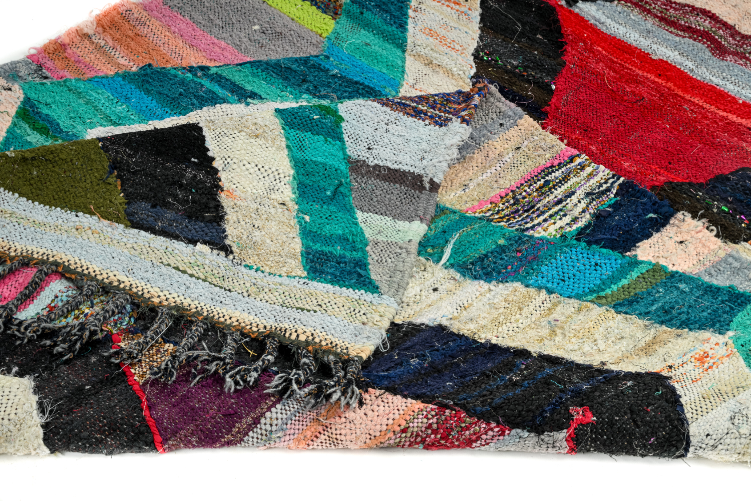 Der Boucherouite-Teppich reiht sich in die fantastischen Teppichkreationen ein, die aus Marokko kommen. Als Flickenteppich wird er aus gebrauchten Textilien wie Wolle, Garn, Kunstfasern und anderen Textilmaterialien hergestellt, die wiederverwertet werden können. Dieser wunderschöne marokkanische Flickenteppich ist das Ergebnis der Veränderungen, die in den letzten Jahren in Marokko auf dem Land stattgefunden haben, wo die herkömmlich nomadische Kultur fester Landwirtschaft und anderen Formen des Broterwerbs gewichen ist. Hierdurch ist die kostbare Schurwolle, das Material der Beni-Ourain- und Azilal-Teppiche, noch seltener geworden. Deswegen ist es umso wichtiger, gebrauchte Textilien wiederzuverwerten. Die marokkanischen Frauen auf dem Land haben hierin unvergleichliche Fähigkeiten entwickelt. Die Farben und das Muster des Boucherouite-Teppichs kennen wir bereits vom Azilal-Teppich. Beide Teppiche sind auf Kunstausstellungen weltweit zu sehen.