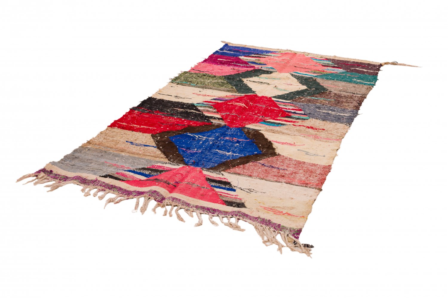 Der Boucherouite-Teppich reiht sich in die fantastischen Teppichkreationen ein, die aus Marokko kommen. Als Flickenteppich wird er aus gebrauchten Textilien wie Wolle, Garn, Kunstfasern und anderen Textilmaterialien hergestellt, die wiederverwertet werden können. Dieser wunderschöne marokkanische Flickenteppich ist das Ergebnis der Veränderungen, die in den letzten Jahren in Marokko auf dem Land stattgefunden haben, wo die herkömmlich nomadische Kultur fester Landwirtschaft und anderen Formen des Broterwerbs gewichen ist. Hierdurch ist die kostbare Schurwolle, das Material der Beni-Ourain- und Azilal-Teppiche, noch seltener geworden. Deswegen ist es umso wichtiger, gebrauchte Textilien wiederzuverwerten. Die marokkanischen Frauen auf dem Land haben hierin unvergleichliche Fähigkeiten entwickelt. Die Farben und das Muster des Boucherouite-Teppichs kennen wir bereits vom Azilal-Teppich. Beide Teppiche sind auf Kunstausstellungen weltweit zu sehen.