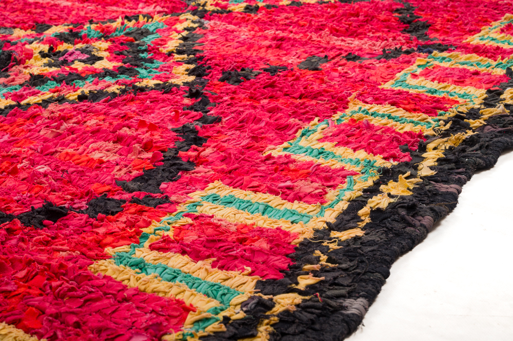 Der Boucherouite-Teppich reiht sich in die fantastischen Teppichkreationen ein, die aus Marokko kommen. Als Flickenteppich wird er aus gebrauchten Textilien wie Wolle, Garn, Kunstfasern und anderen Textilmaterialien hergestellt, die wiederverwertet werden können. Dieser wunderschöne marokkanische Flickenteppich ist das Ergebnis der Veränderungen, die in den letzten Jahren in Marokko auf dem Land stattgefunden haben, wo die herkömmlich nomadische Kultur fester Landwirtschaft und anderen Formen des Broterwerbs gewichen ist. Hierdurch ist die kostbare Schurwolle, das Material der Beni-Ourain- und Azilal-Teppiche, noch seltener geworden. Deswegen ist es umso wichtiger, gebrauchte Textilien wiederzuverwerten. Die marokkanischen Frauen auf dem Land haben hierin unvergleichliche Fähigkeiten entwickelt. Die Farben und das Muster des Boucherouite-Teppichs kennen wir bereits vom Azilal-Teppich. Beide Teppiche sind auf Kunstausstellungen weltweit zu sehen.