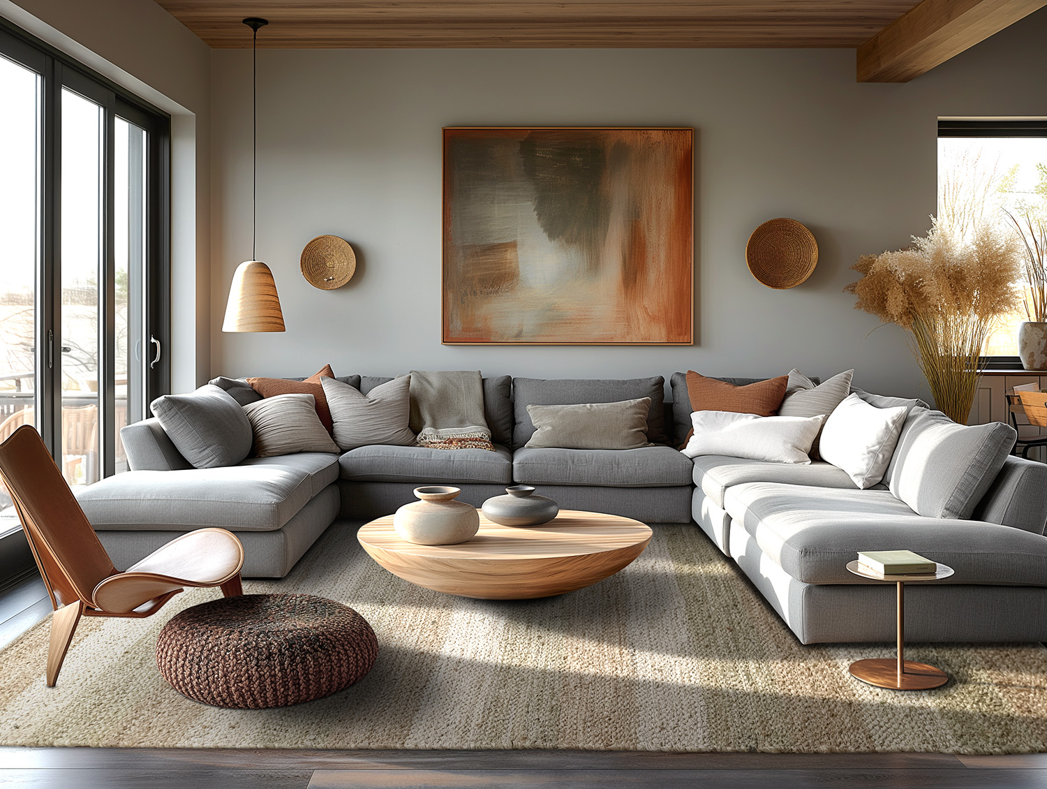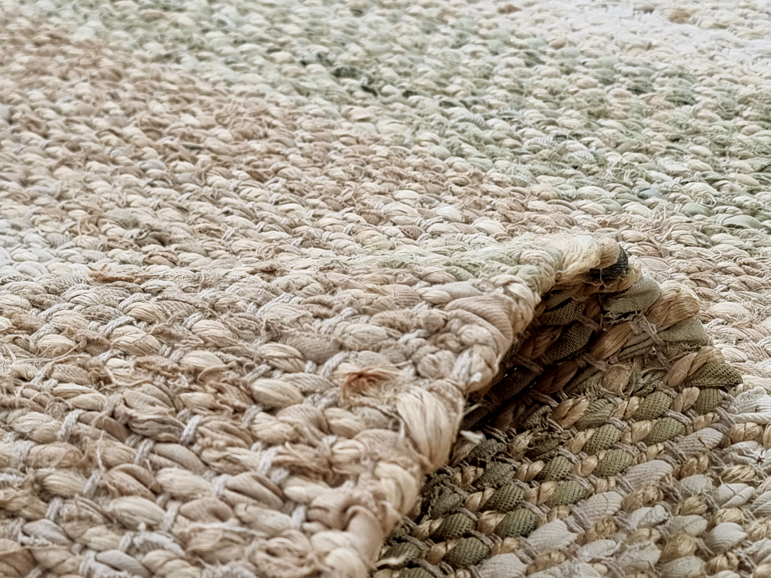 Handgewebter Teppich aus Jute und Denim. Stammt aus der Natur. Charakteristisch grob und stark, wie ein Juteteppich sein soll.