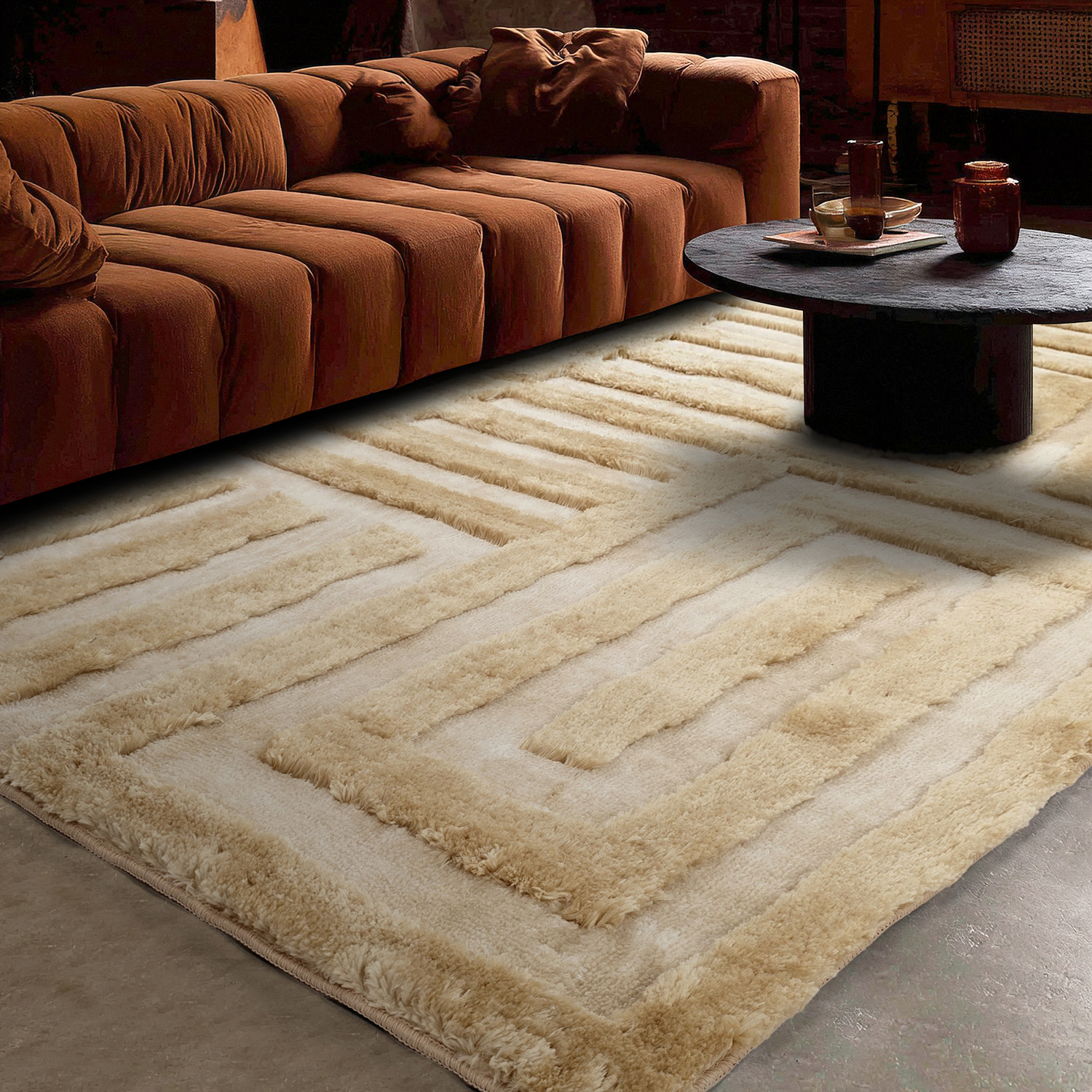 Eleganter Hochflorteppich mit High-and-Low-Struktur, der dem Raum ein modernes und lebendiges Gefühl verleiht. Der Teppich hat einen unterschiedlich hohen Flor, was ihm eine taktile Oberfläche und ein schönes Tiefenspiel im Licht verleiht. Der dichte Flor macht den Teppich weich und angenehm zu begehen, während die niedrigeren Partien das Muster betonen und ihm einen exklusiven Charakter verleihen.