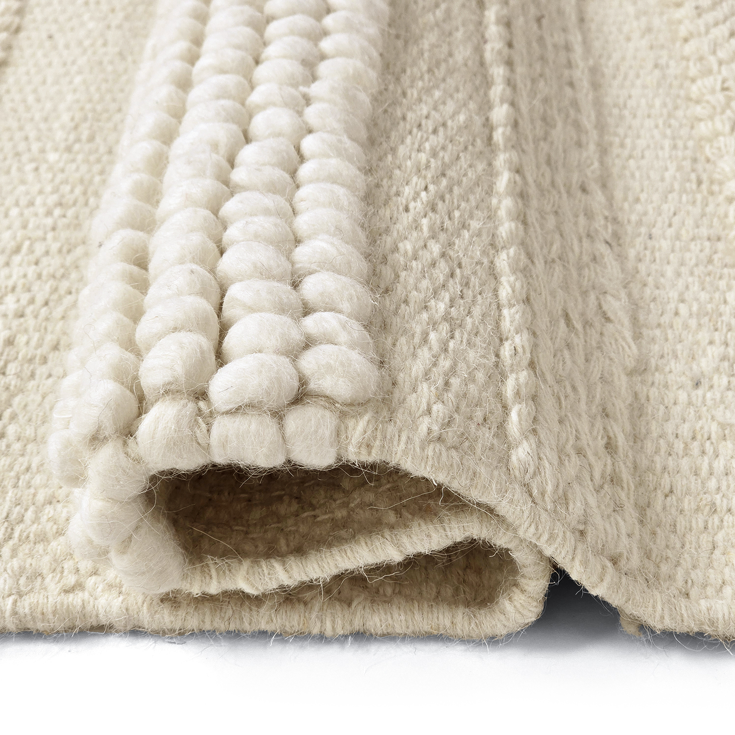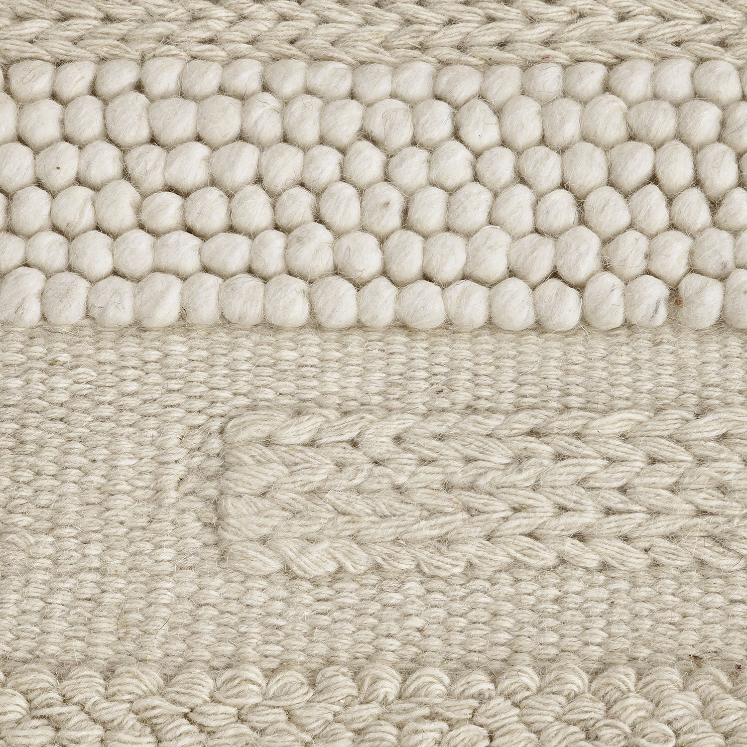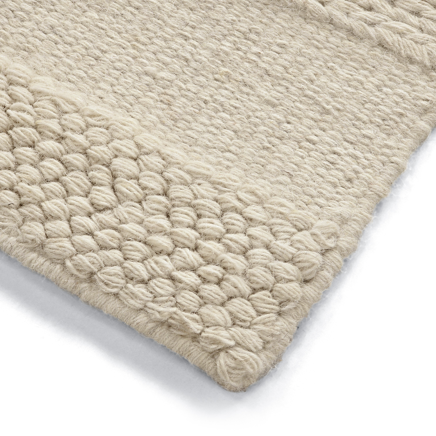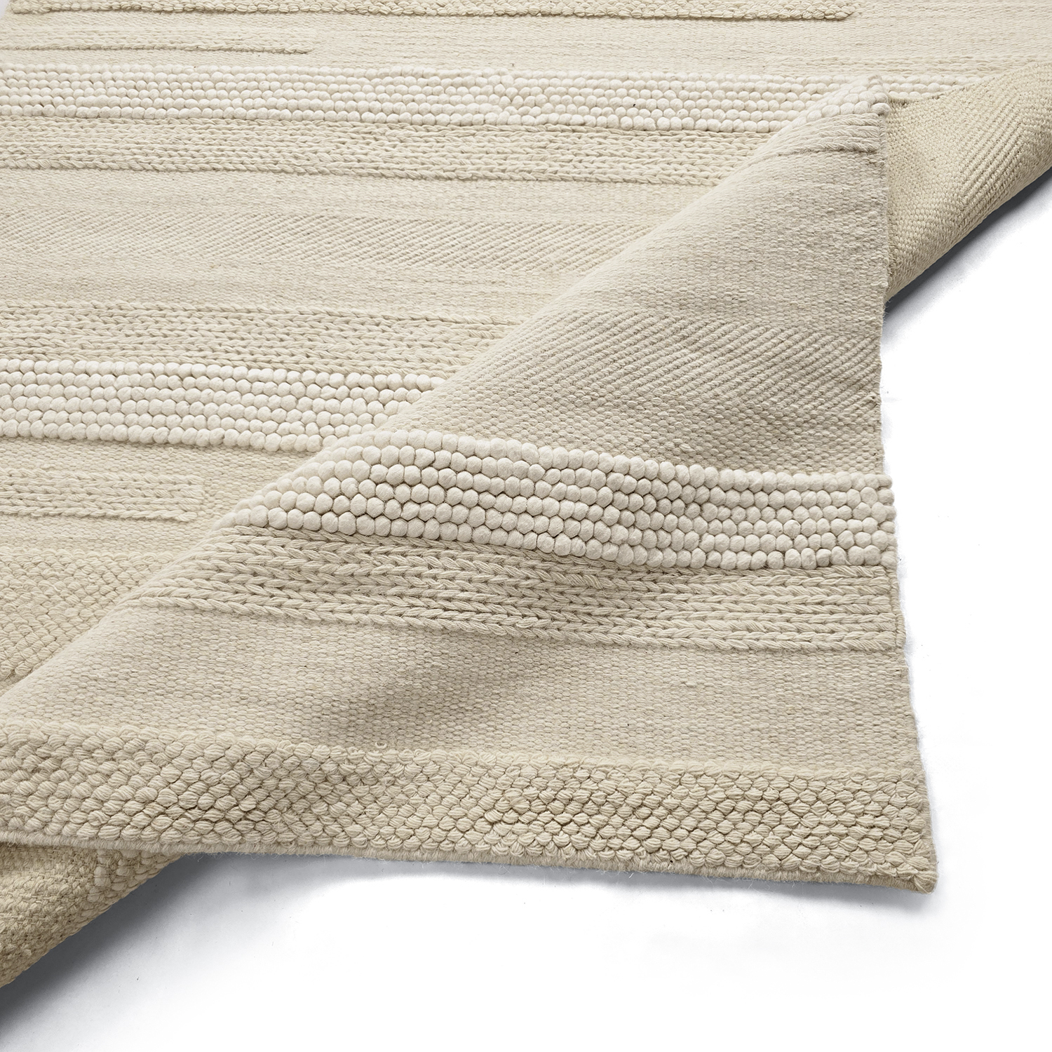 Wollteppich mit einem Muster, das durch verschiedene Webtechniken dezent zur Geltung kommt. Die einzelnen Partien sind handgewebt und variieren in der Struktur, wodurch Licht und Schatten unterschiedlich eingefangen werden. Das Ergebnis ist ein zeitloser Teppich mit taktilem Gefühl und künstlerischem Charakter – ideal für alle, die ein modernes und zugleich harmonisches Wohnaccessoire suchen.