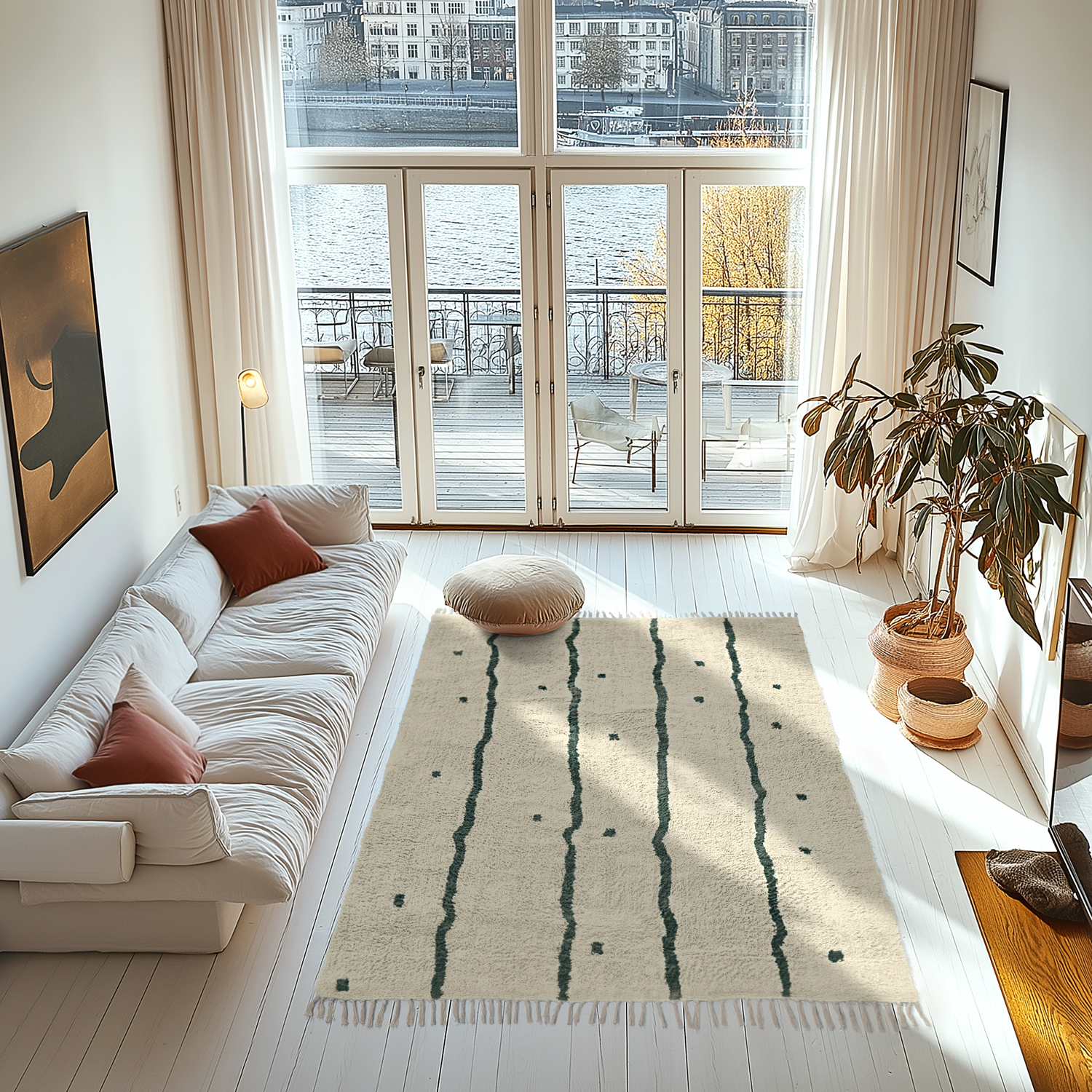 Das zeitlose Design unseres Baumwollteppichs fügt sich perfekt in verschiedene Einrichtungsstile ein und ist somit die perfekte Wahl, ob Sie Ihr Zuhause erneuern oder Ihre bestehende Einrichtung ergänzen möchten.