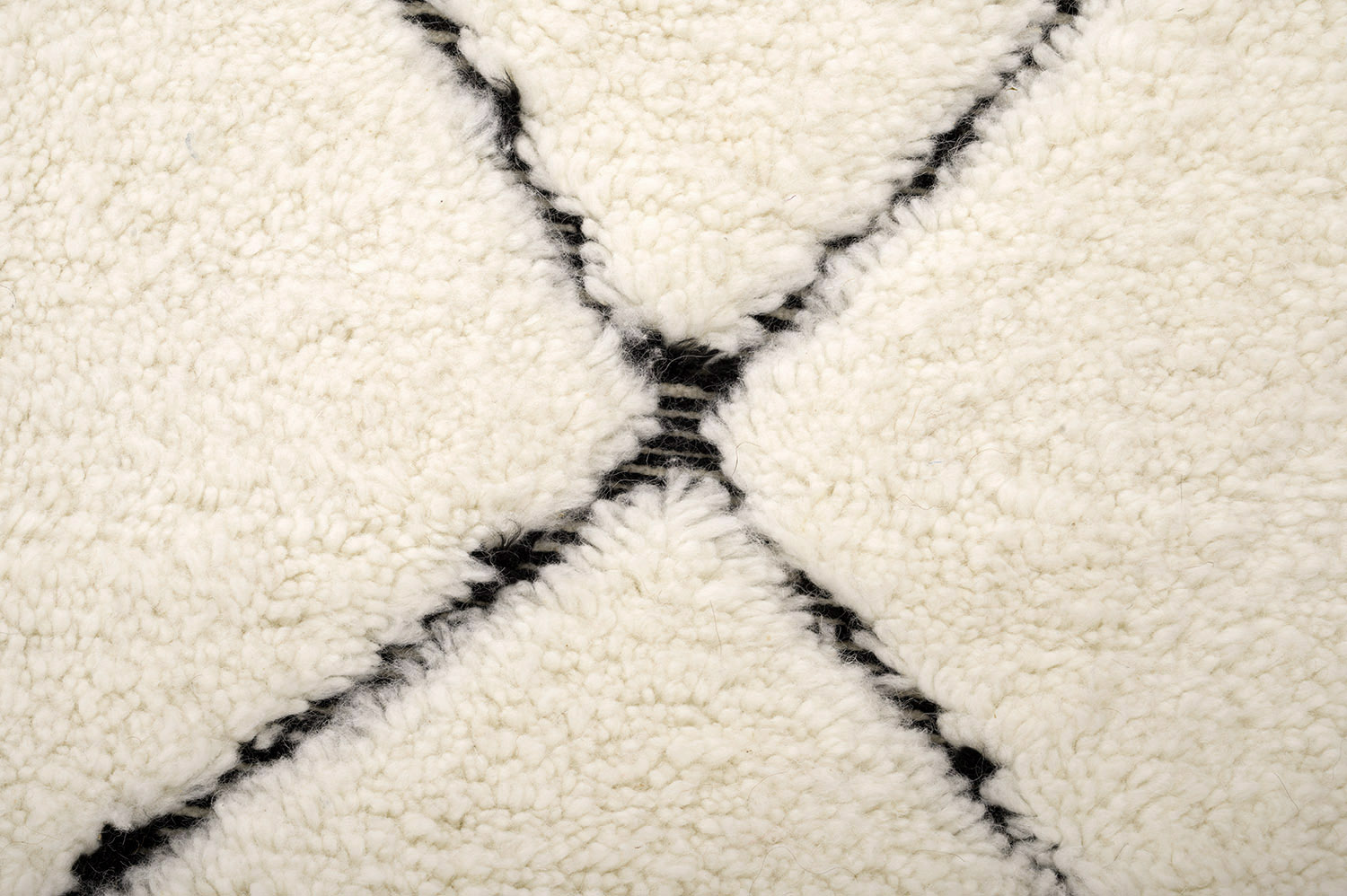 Die Wolle der Schafe im Atlasgebirge ist einfach unvergleichlich. Ein Beni Ourain-Teppich wird nur aus dieser Wolle und ihren natürlichen Farben hergestellt. Ein echter Beni Ourain-Teppich wird mit einfachen, raffinierten Mustern gewebt. Er ist bei Designern und Verbrauchern auf der ganzen Welt sehr gefragt. Ein echter Beni Ourain ist ein Kunstwerk für den Boden. Bei richtiger Pflege behält der Teppich seine schönen Farben und die Wolle nutzt sich nicht ab. Ein Teppich, der von Generation zu Generation weitergegeben wird.