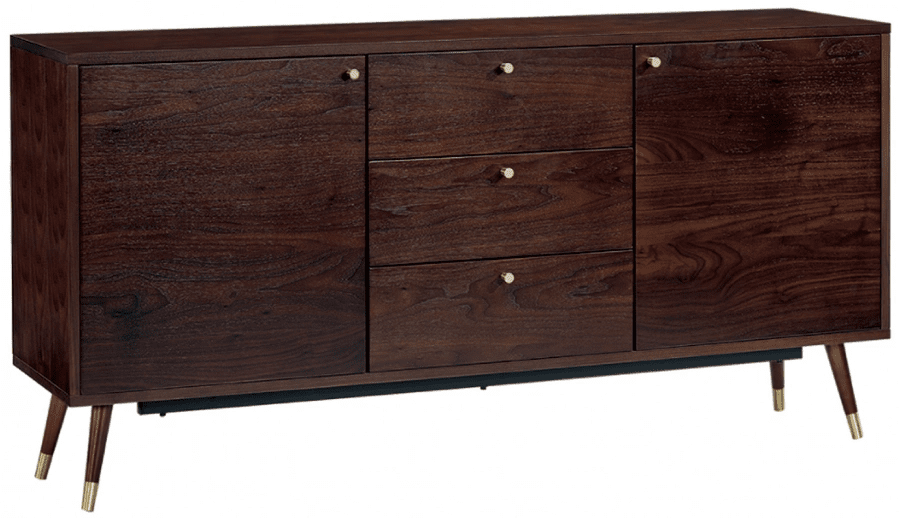 Le buffet est fabriqué en placage de noyer rustique avec des veines naturelles et de subtils détails en laiton brossé, offrant un équilibre parfait entre élégance classique et modernité.