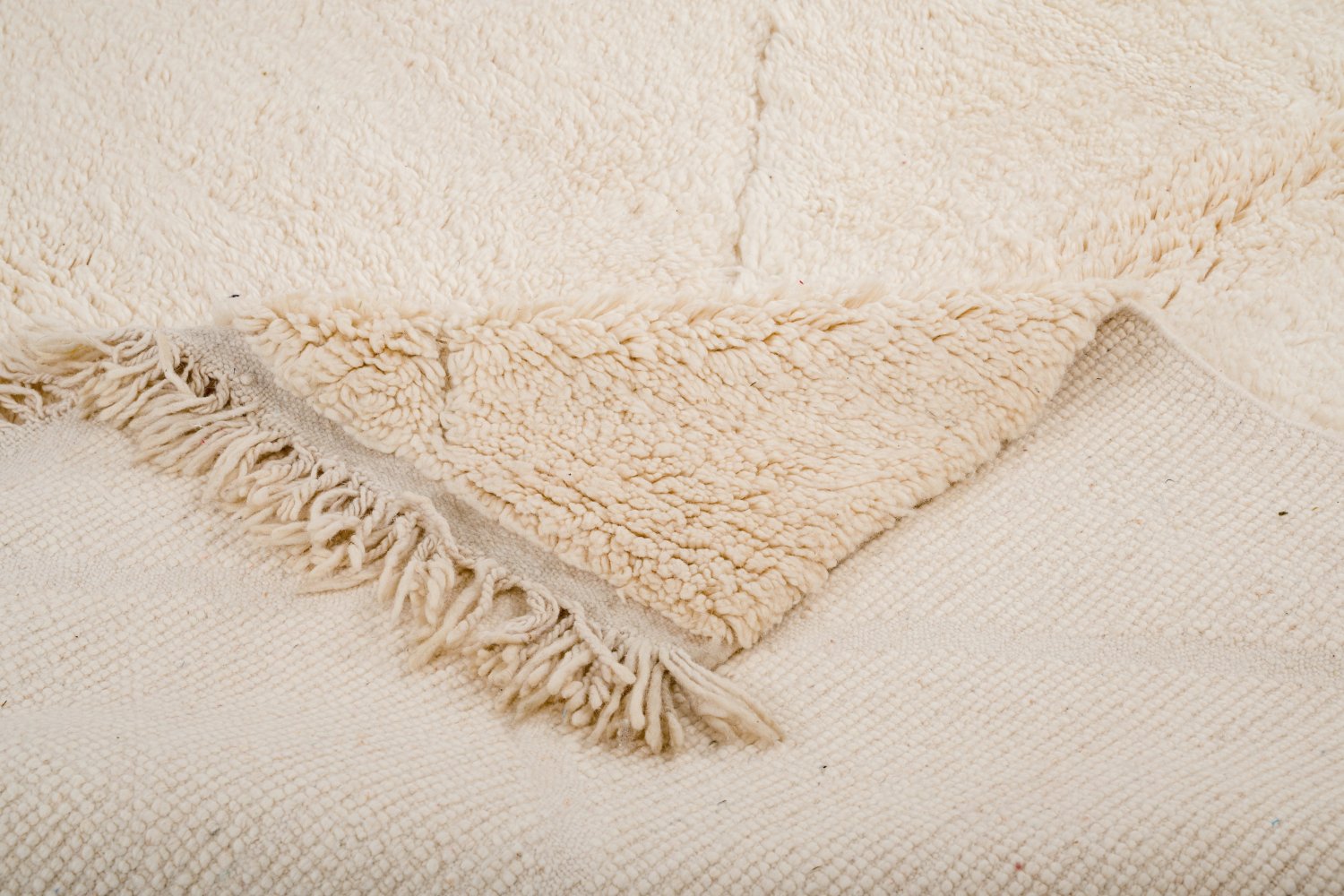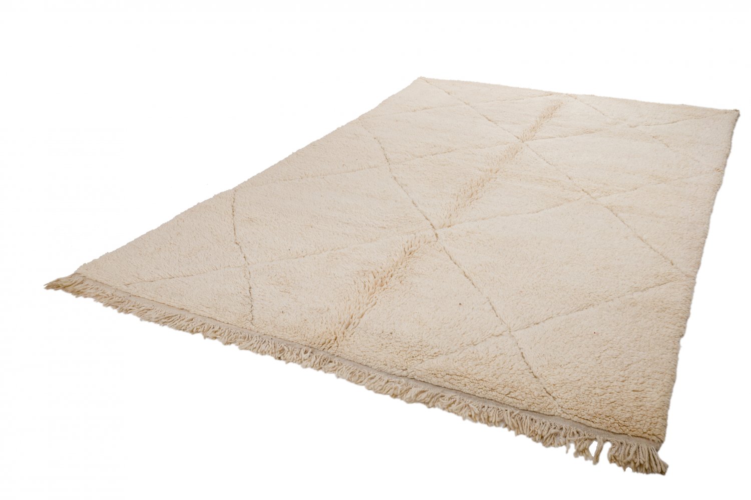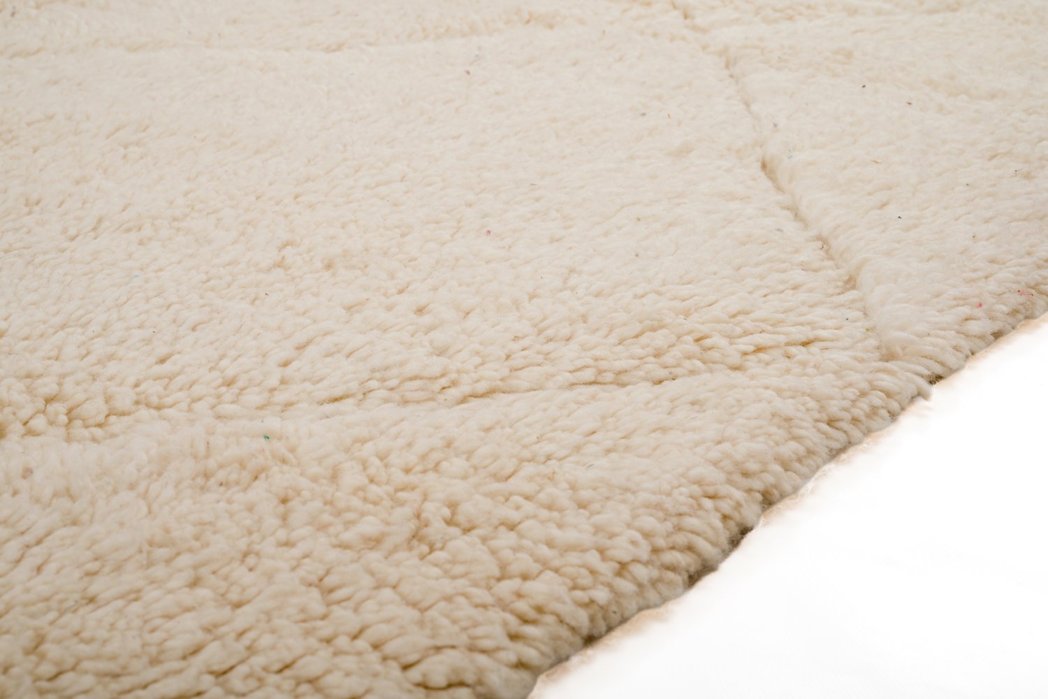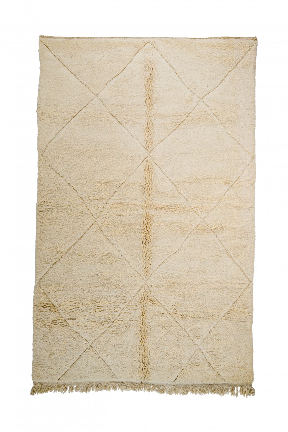 La laine des moutons des montagnes de l'Atlas est véritablement inégalée et un tapis Beni Ourain est fait uniquement de cette laine pure dans ses couleurs naturelles. Un véritable tapis Beni Ourain est tissé avec des motifs simples et sophistiqués, ce qui le rend très demandé par les designers et les consommateurs du monde entier. Un tapis marocain Beni Ourain est une œuvre d'art pour le sol. S'il est entretenu avec soin, le tapis conservera ses belles couleurs et la laine ne s'usera pas. Un tapis à transmettre de génération en génération.